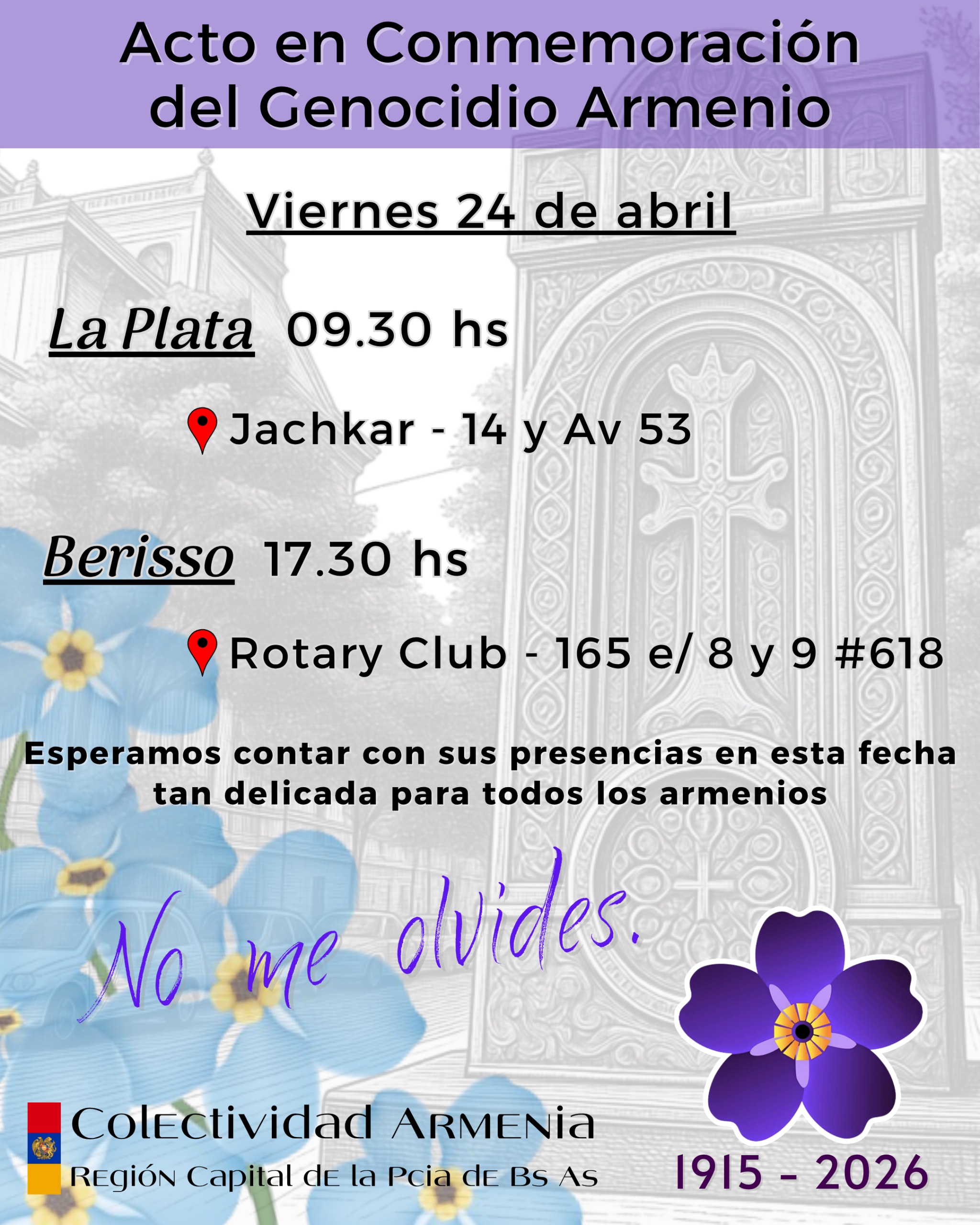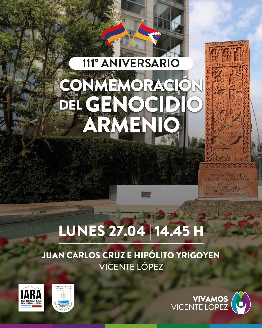 ACTO CENTRAL POR EL 111°ANIVERSARIO DEL GENOCIDIO ARMENIO El encuentro tendrá lugar el viernes 24 de abril a las 19:00 h, en el Memorial “No Me Olvides” (Dorrego y el río, Rosario). En el marco de esta conmemoración, se realizará el estreno del microdocumental “Del Ararat al Paraná: Memorias Infinitas”. Esta producción audiovisual recoge testimonios […]